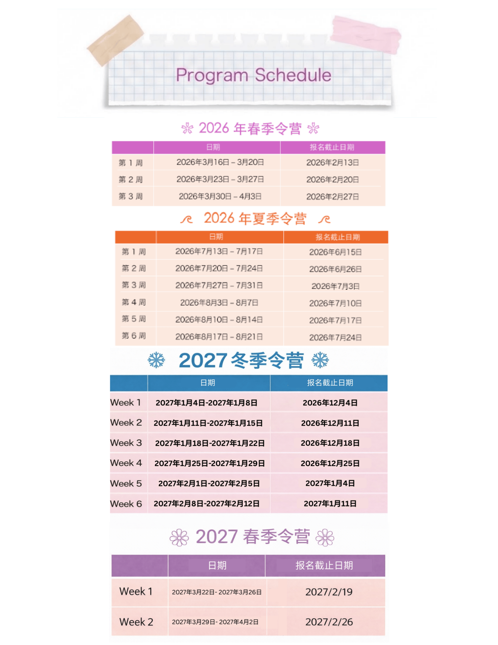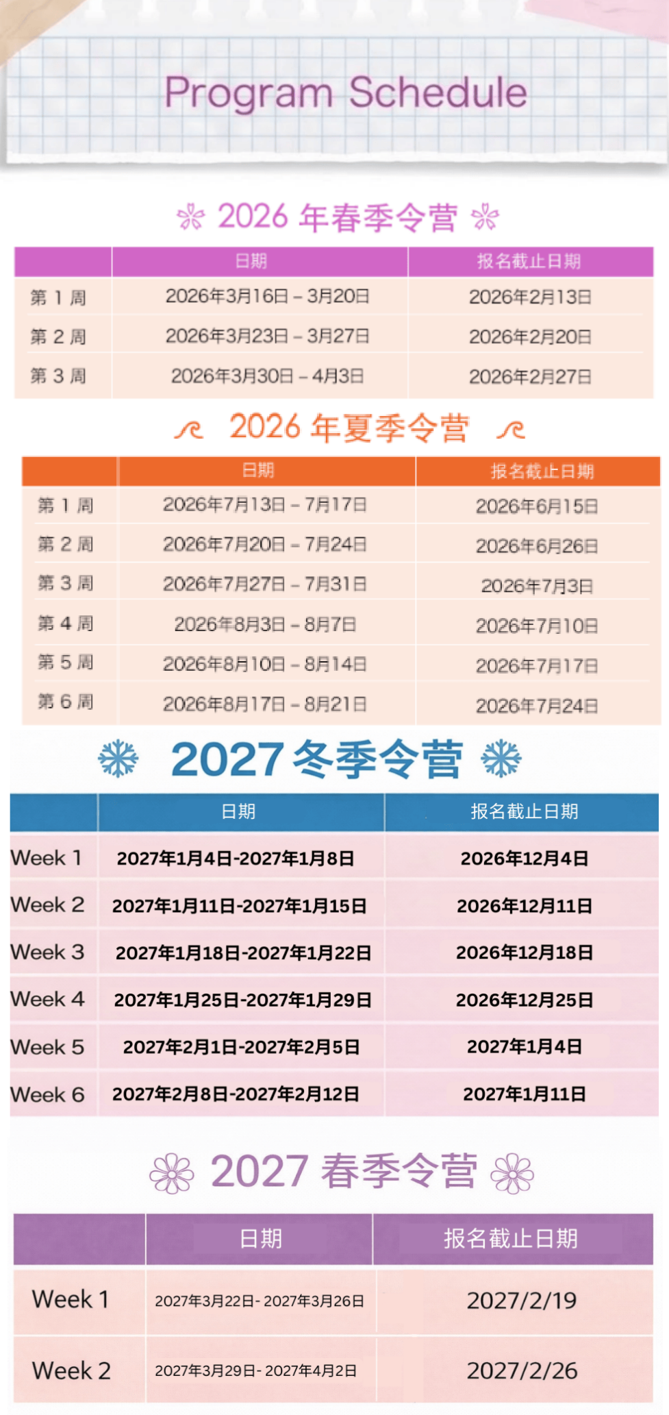 2026 夏季(7 月 13 日 – 8 月 21 日): 请于 2026 年 4 月 24 日前 完成报名