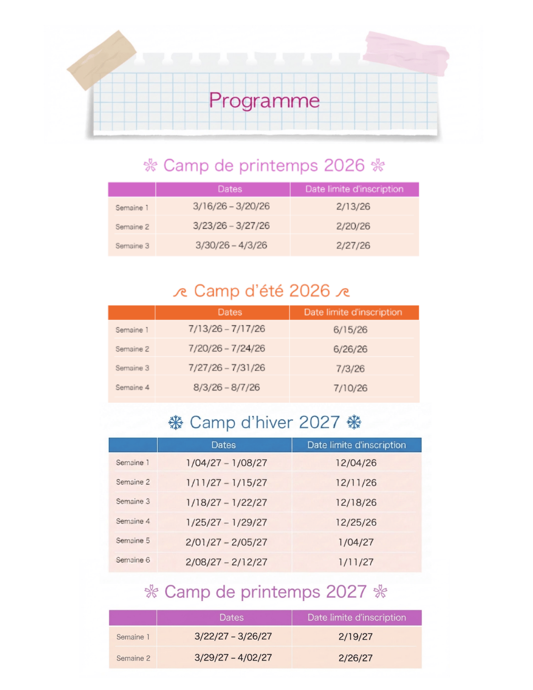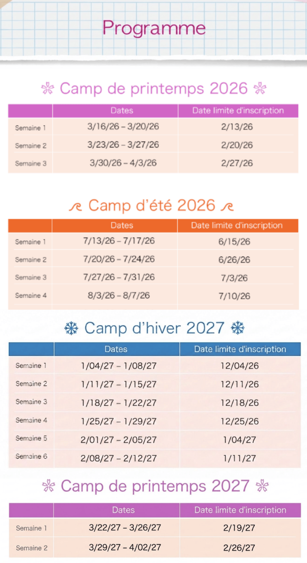 • Printemps 2026 (16 mars – 3 avril): inscription avant le 29 décembre 2025