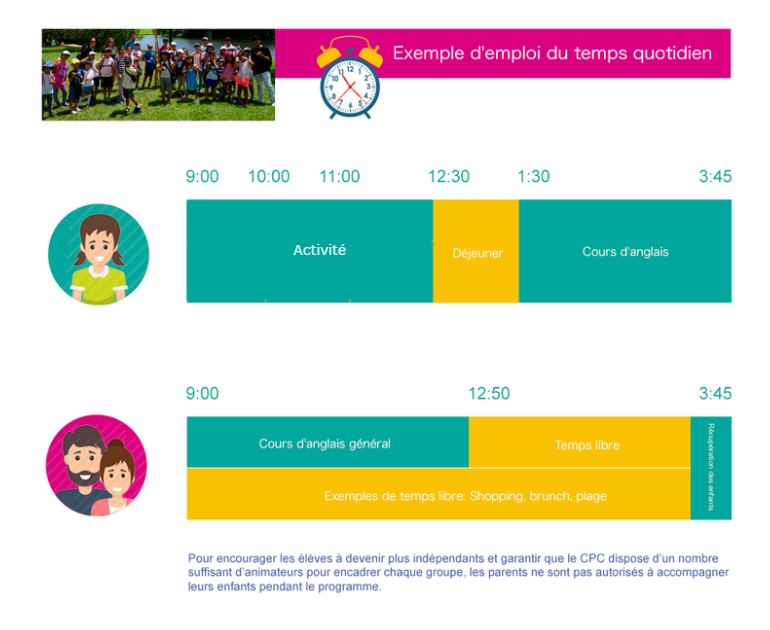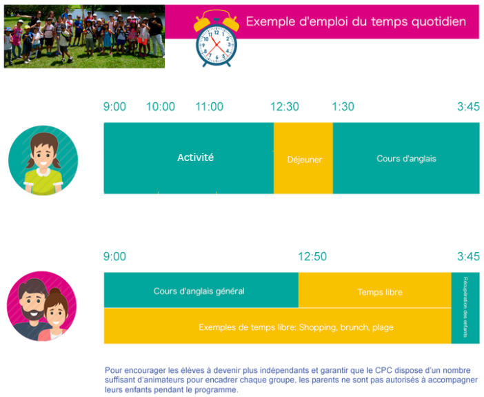 Des cours en petits groupes, organisés selon l’âge et le niveau d’anglais, animés par des enseignants étrangers, axés sur la pratique de l’oral et de l’écoute (3 heures).