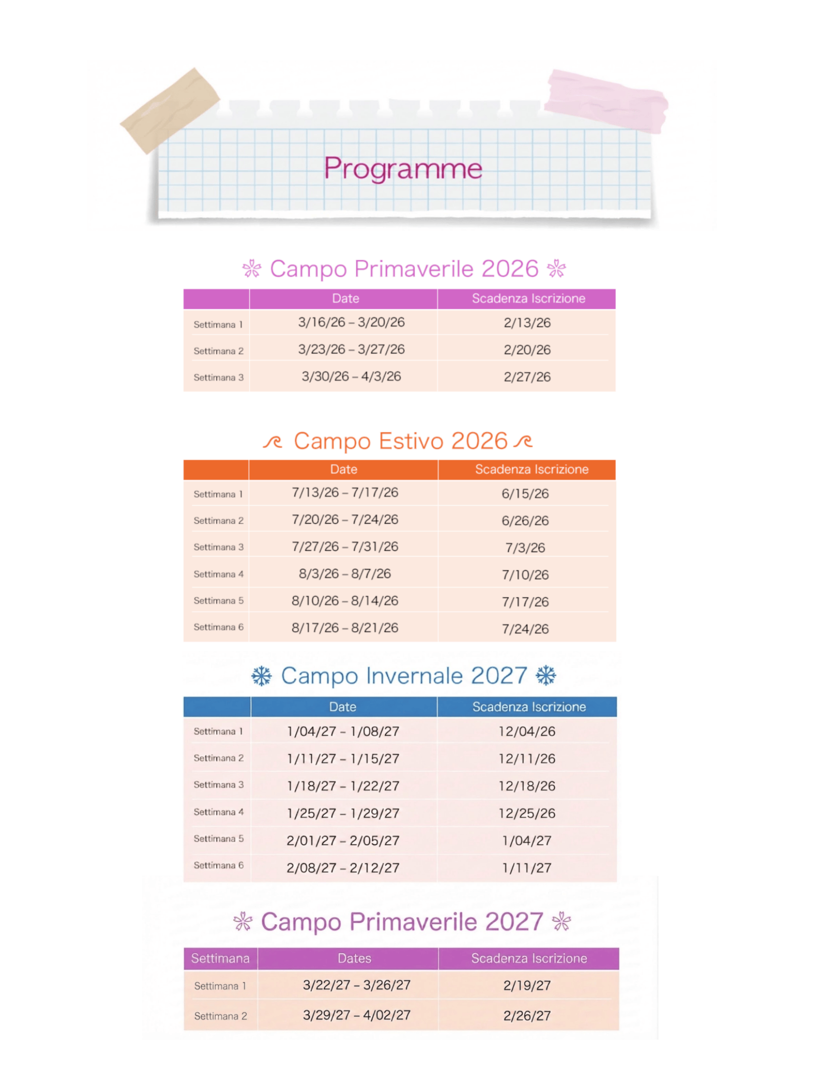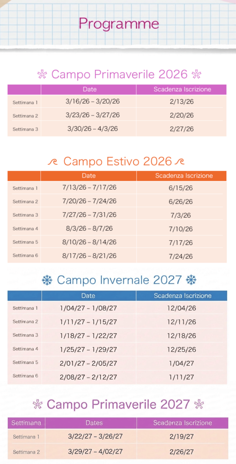 • Primavera 2026 (16 marzo – 3 aprile): iscrizione entro il 29 dicembre 2025