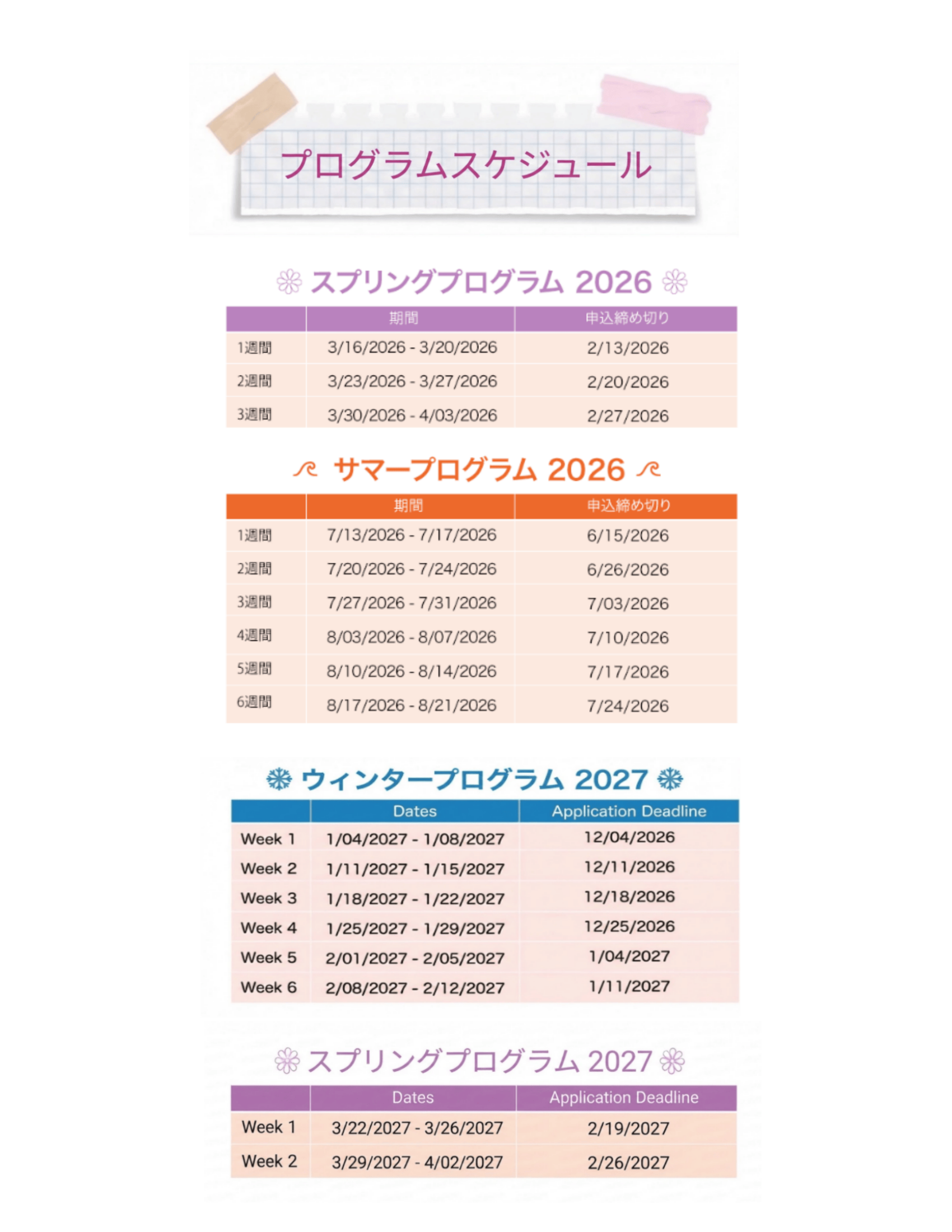 • サマー 2026(7/13〜8/21):申込期限 4/24/2026