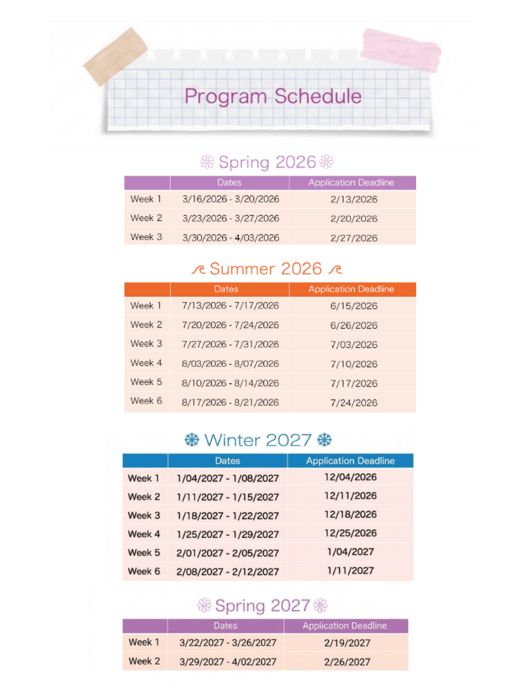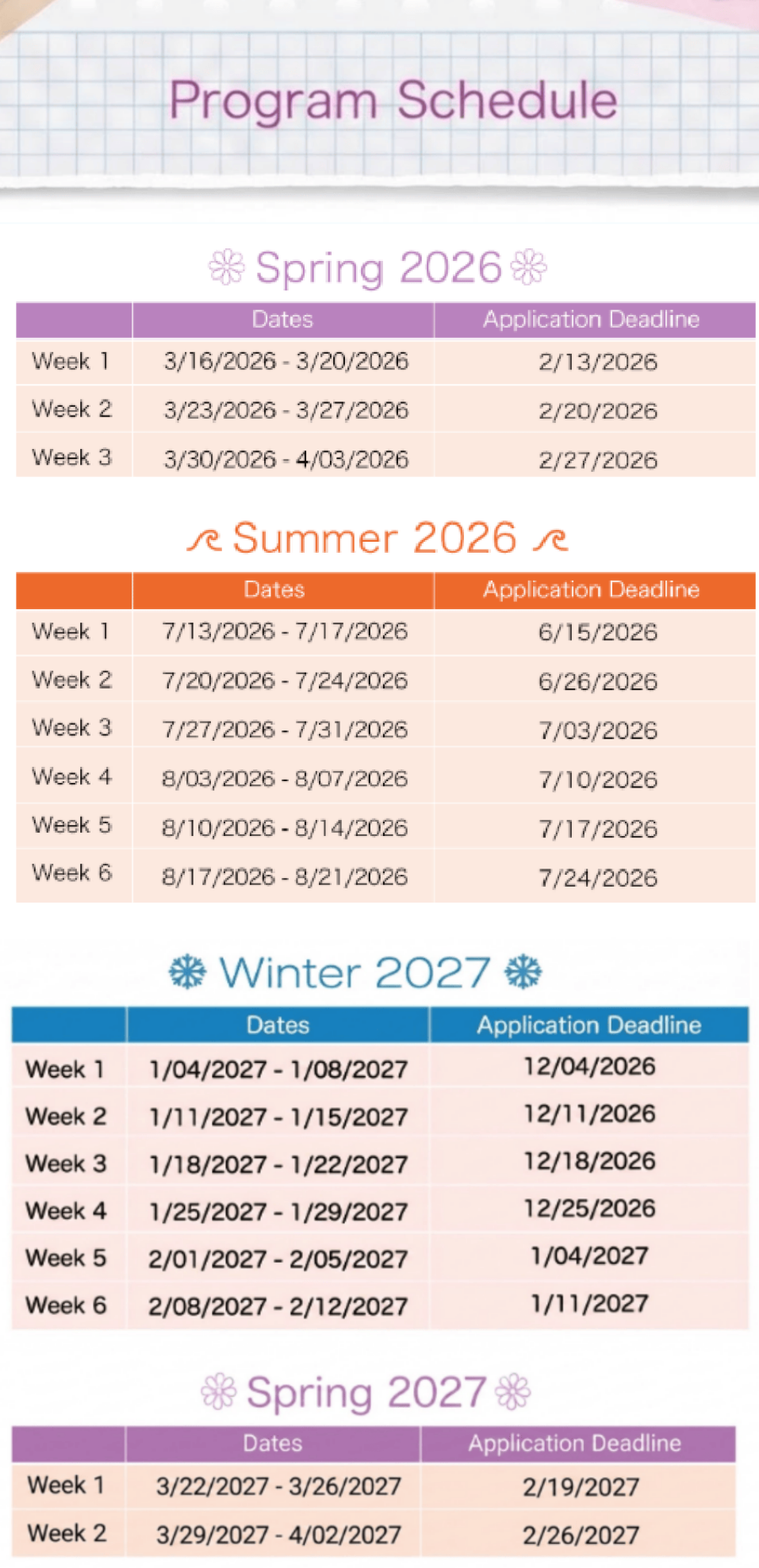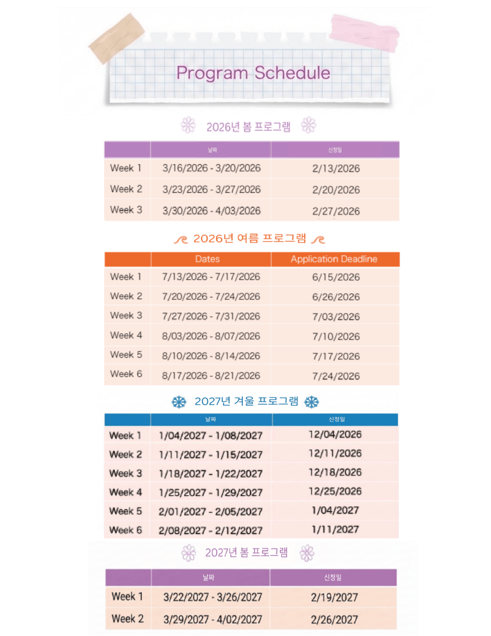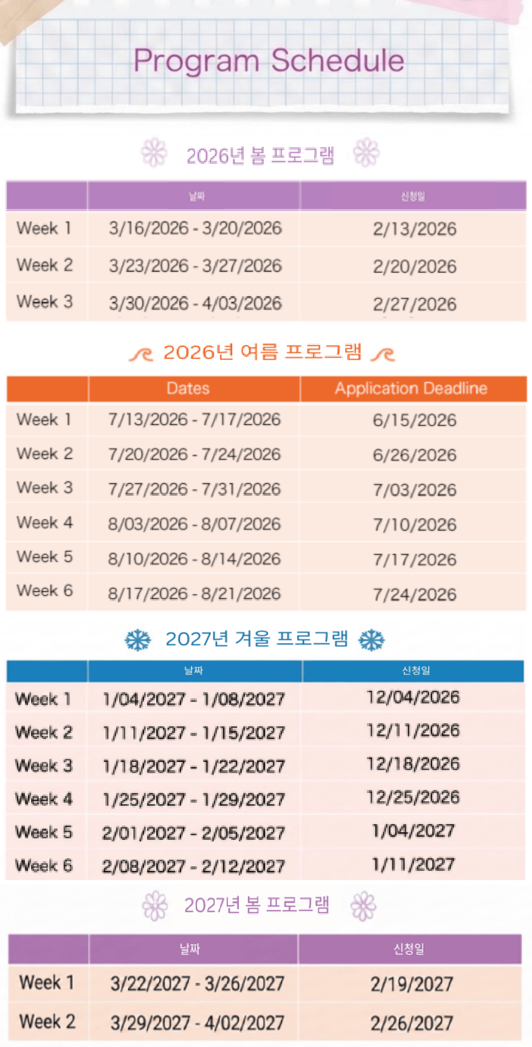 • 2026 봄 프로그램 (3월 16일 – 4월 3일): 2025년 12월 29일까지 등록
