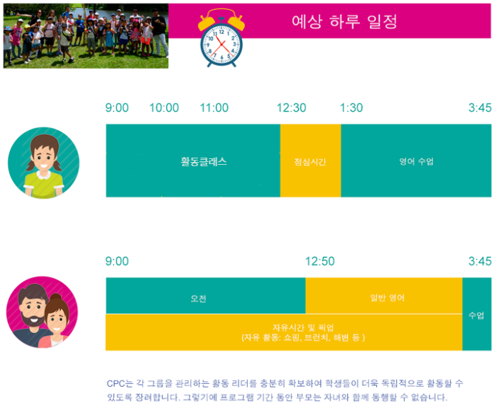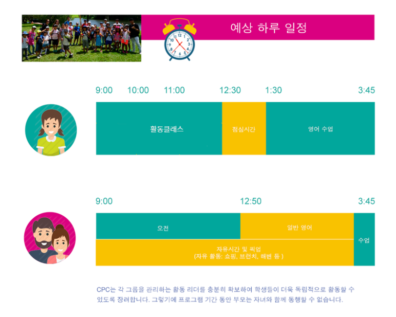 "CPC에서 우리 아이들을 부모가 가기 힘든 곳까지 데려가 주어서 좋았어요. 영어뿐만 아니라 일본어를 할 수 있는 선생님과 스태프도 있어서 안심할 수 있었습니다."