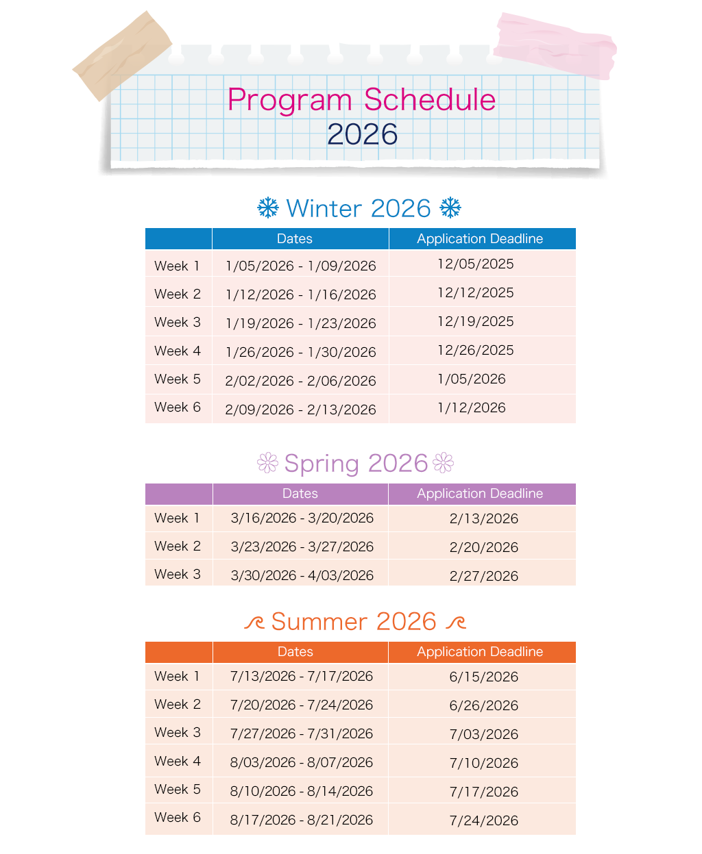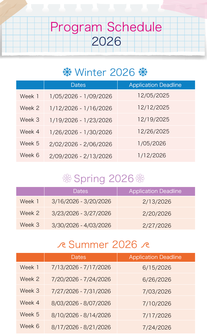 • Summer 2026 (July 13 - August 21): Enroll by April 24, 2026